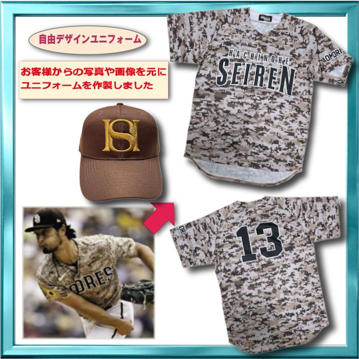 お客様からの現在ご使用中のユニフォーム写真を送っていただき 迷彩柄のフルオープン昇華ユニフォームと刺繍帽子を作製しました。 (この野球ユニフォームの詳細情報は コチラ) |