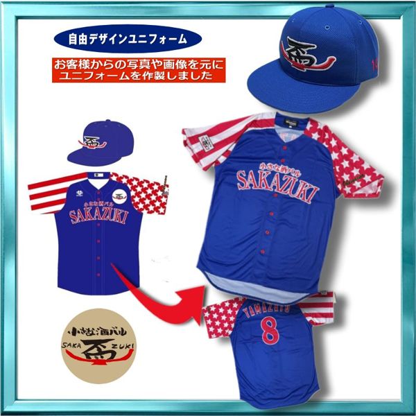 お客様からのオリジナルデザインの持ち込み画像を元に昇華ユニフォームと刺繍帽子を作製しました。 (この野球ユニフォームの詳細情報は コチラ) |